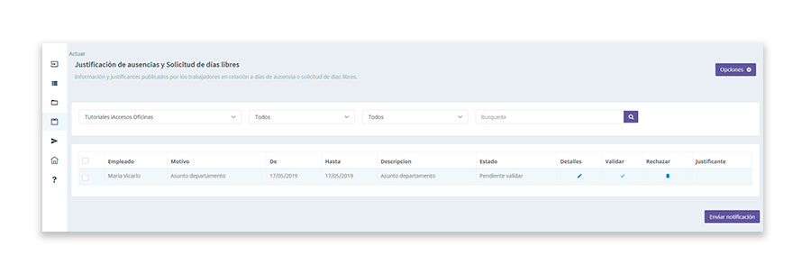 El módulo de justificantes permite gestionar los documentos aportados por los empleados para justificar las incidencias, ya sean de retraso o ausencia. En la mayoría de los casos se asume que el registro de justificantes es realizado por el propio empleado desde su zona privada, sin embargo, el responsable o supervisor también puede realizar la publicación de un justificante desde este apartado.