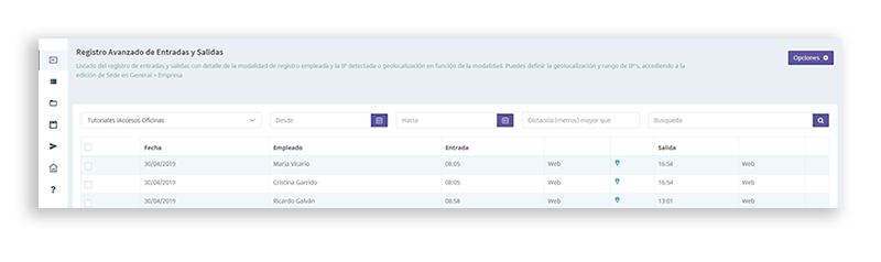 Las vistas de iAccesos han sido diseñadas para facilitar la consulta de los accesos del día en curso o de la selección de días definida para los accesos de un empleado. La barra superior permite aplicar los filtros que deben aplicarse a la vista de accesos presentada.